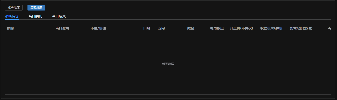 - 策略维度:显示策略维度的当日持仓、当日委托、当日成交