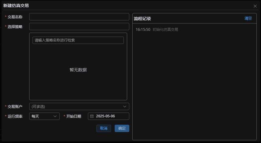 - 创建仿真策略:点击【+ 创建仿真策略】,填写策略交易配置参数: